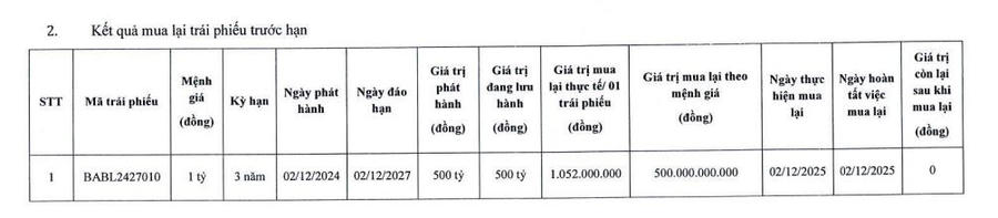 Cụ thể, vào ngày 2/12, Bac A Bank đã thực hiện mua lại trước hạn toàn bộ lô trái phiếu mã BABL2427010, giá trị mua lại thực tế 1,052 tỷ đồng/trái phiếu.