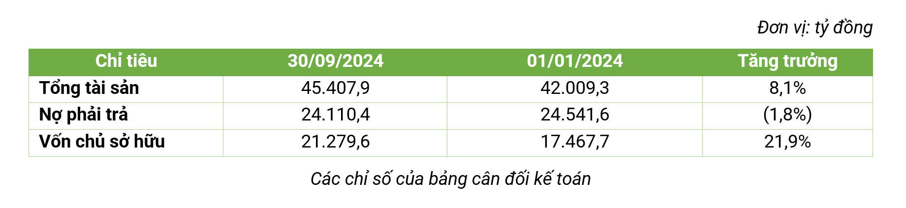 Nhờ vào việc chủ động tăng vốn, tỷ lệ nợ trên vốn chủ sở hữu giảm đáng kể từ 2,2 lần tại cuối năm 2022 xuống còn 1,1 lần tại thời điểm 30/09/2024. Bên cạnh đó, tỷ lệ nợ vay trên vốn chủ sở hữu giảm về chỉ còn 0,6 lần, thấp hơn so với các doanh nghiệp cùng ngành.