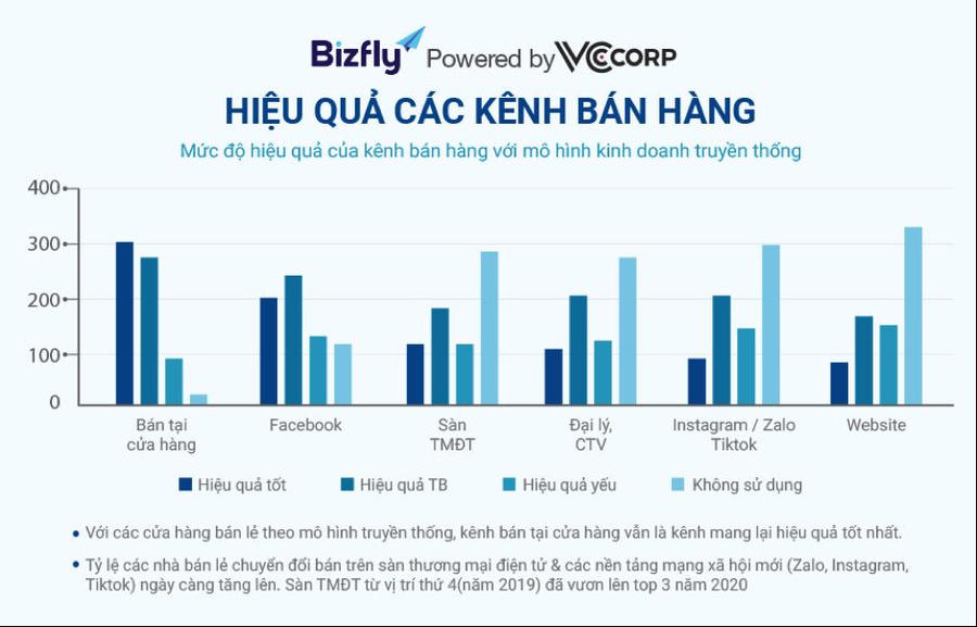 Kênh bán hàng trên sàn thương mại điện tử đã vươn lên chiếm vị trí đầu bảng trong các kênh bán hàng hiệu quả năm 2020, thế chân Facebook và ngay sau là quảng cáo trên nền tảng mạng xã hội mới (Tiktok, Zalo). Sự chuyển đổi về kênh bán hàng và tình hình sụt giảm doanh thu đã ảnh hưởng đến ngân sách quảng cáo tiếp thị trung bình của mỗi nhà bán hàng.
