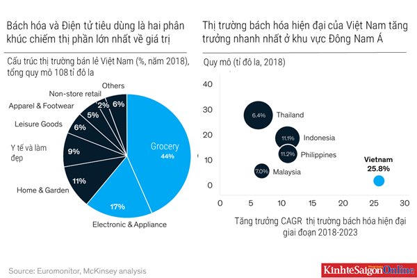 Theo đánh giá của hãng tư vấn McKinsey, lĩnh vực bán lẻ hiện đại Việt Nam dự kiến sẽ tăng trưởng nhanh chóng trong năm năm tới, với tốc độ tăng trưởng bình quân hằng năm 25,8% trong giai đoạn 2018-2023, cao hơn gấp đôi so với bất kỳ quốc gia nào khác trong khu vực.