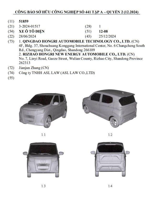 Theo công báo sở hữu công nghiệp số 441 tập A - quyển 2 tháng 12/2024, một mẫu ô tô điện mới đã được đăng ký bảo hộ kiểu dáng công nghiệp ở Việt Nam. Đơn vị đăng ký là Qingdao Hongri Automobile, tới từ Trung Quốc.