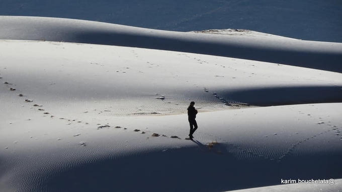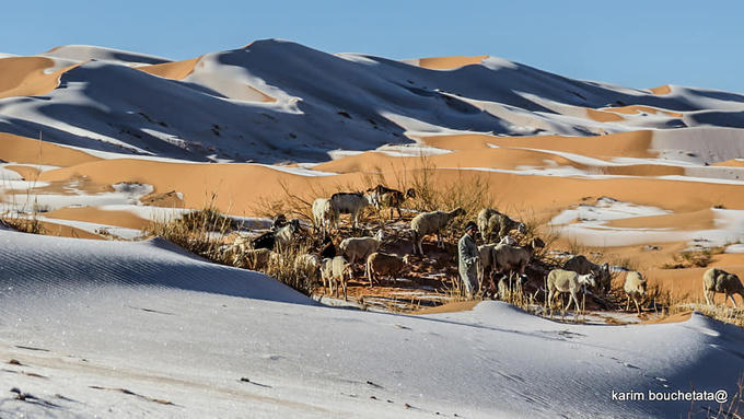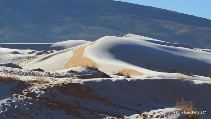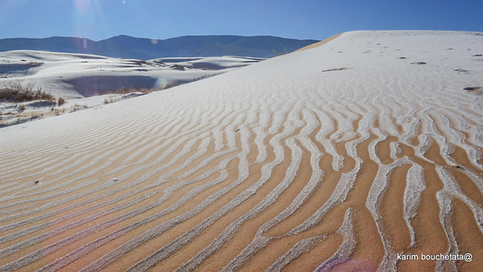 Tuyết rơi ở sa mạc là hiện tượng hiếm khi xảy ra nhưng đây không phải lần đầu. Năm 2016, nhiếp ảnh gia nghiệp dư Bouchetata từng gây xôn xao vì đã chụp lại trận tuyết rơi đầu tiên trên sa mạc nóng nhất thế giới sau 37 năm.