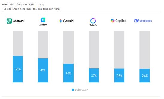 Dù các nền tảng quốc tế chiếm lĩnh thị trường về số lượng người dùng, các sản phẩm nội địa lại cho thấy thế mạnh trong việc đáp ứng nhu cầu của người Việt. Theo bảng xếp hạng mức độ hài lòng của khách hàng (Customer Satisfaction Score), AI Hay đã xuất sắc vươn lên vị trí thứ hai, chỉ sau ChatGPT và vượt qua nhiều đối thủ lớn khác như Gemini hay DeepSeek.