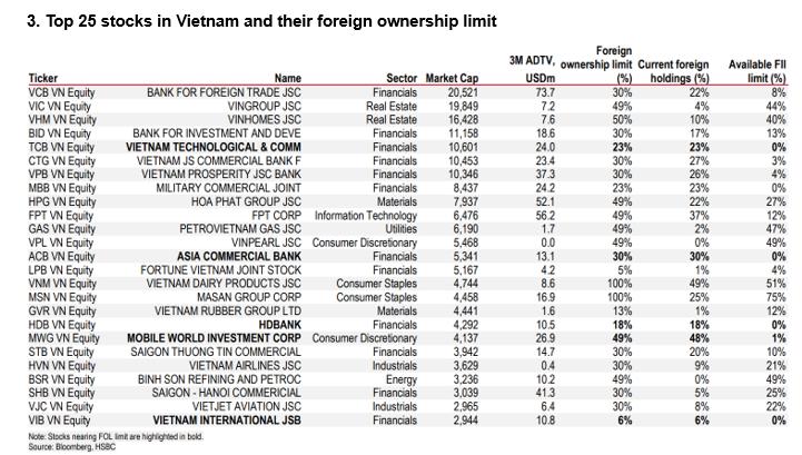 Mặc dù đây có thể không phải là yêu cầu nghiêm ngặt đối với FTSE trong việc tái phân loại, nhưng nó có thể là vấn đề được nhà đầu tư đề cập.Hiện tại, chỉ có 12 cổ phiếu trong VN-Index đã đạt đến giới hạn FOL. Tổng thể, VN-Index có tỷ lệ FOL là 42%, trong khi tỷ lệ sở hữu nước ngoài hiện tại chỉ dưới một nửa giới hạn, khoảng 17%.3.