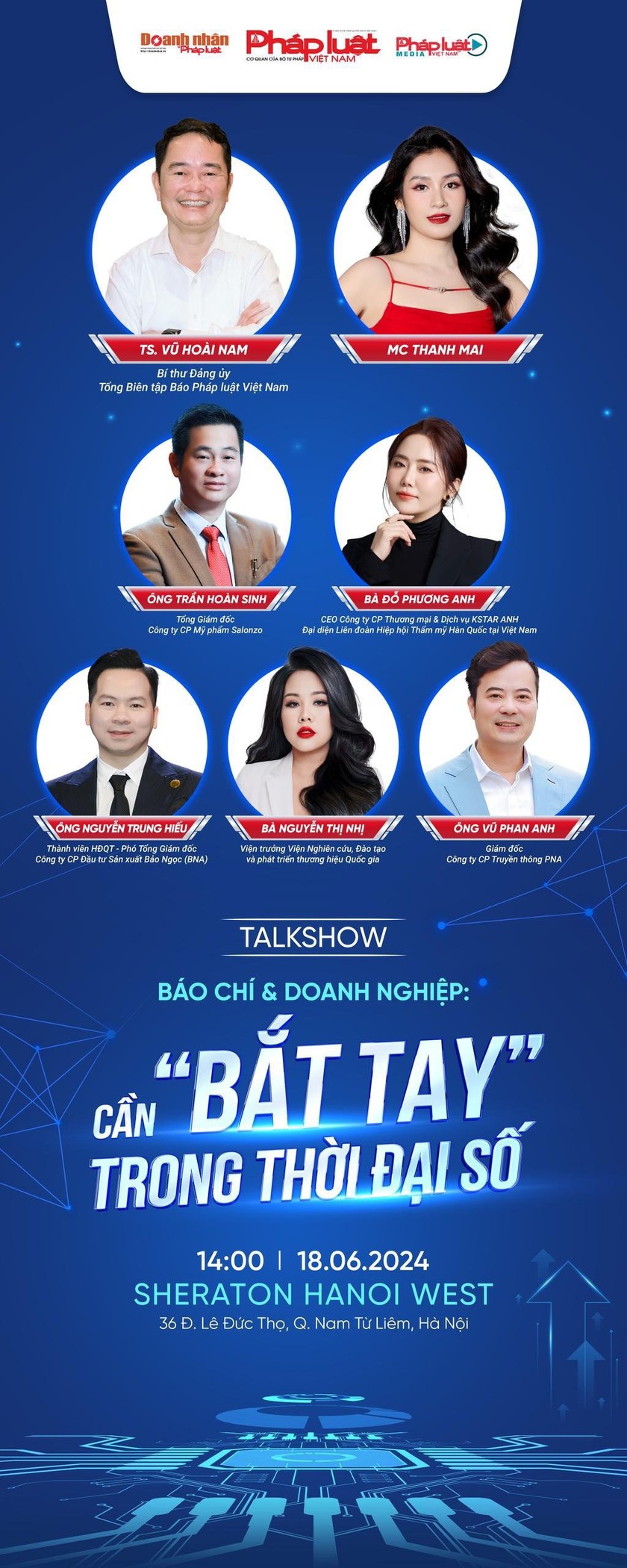 Tham dự Talkshow với chủ đề: “Báo chí & Doanh nghiệp: Cần “bắt tay” trong thời đại số” só sự hiện diện của TS.Vũ Hoài Nam – Bí thư Đảng ủy, Tổng Biên tập Báo Pháp luật Việt Nam; Bà Nguyễn Thị Nhị - Viện trưởng Viện Nghiên cứu, Đào tạo và phát triển thương hiệu Quốc gia; Ông Trần Hoàn Sinh – Tổng Giám đốc Công ty Cổ phần Mỹ phẩm Salonzo; Bà Đỗ Phương Anh - CEO Công ty CP Thương mại & Dịch vụ KSTAR ANH; Đại diện Liên đoàn Hiệp hội Thẩm mỹ Hàn Quốc tại Việt Nam; Ông Nguyễn Trung Hiếu – Thành viên HĐQT; Phó Tổng Giám đốc Công ty CP Đầu tư Sản xuất Bảo Ngọc (BNA); Diễn viên – Doanh nhân Phan Anh – Giám đốc Công ty Cổ phần Truyền thông PNA.
