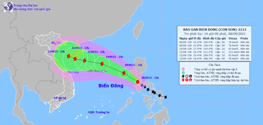 Chiều 9/9, tâm bão cách quần đảo Hoàng Sa khoảng 660 km về phía đông đông nam, sức gió mạnh nhất 90 km/h. Cường độ mạnh nhất duy trì ở cấp 9, giật cấp 11.