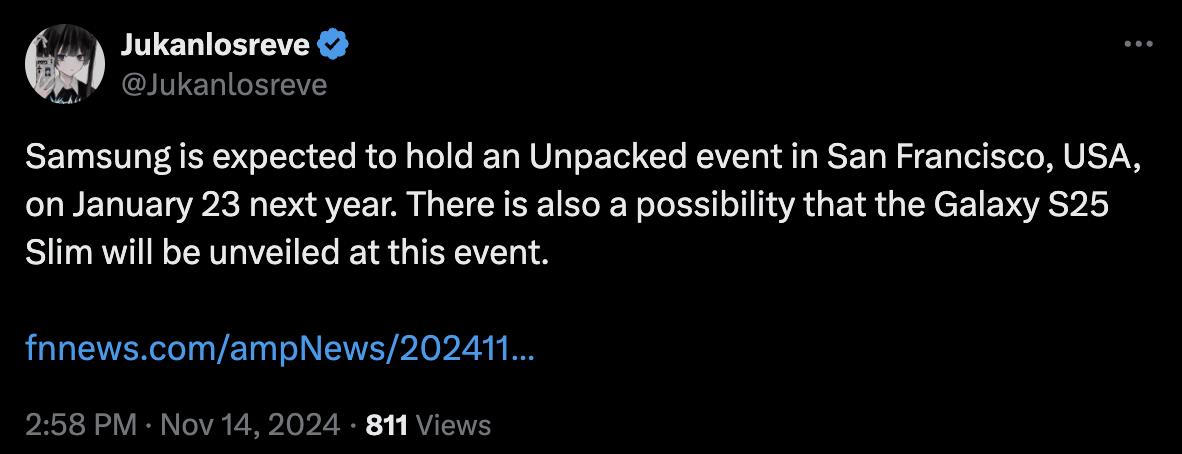 Theo báo cáo từ tờ The Financial News của Hàn Quốc (qua người dùng X là Jukanlosreve), Samsung có thể tổ chức sự kiện Galaxy Unpacked tiếp theo vào ngày 23/1/2025 tại San Francisco, Mỹ. Báo cáo này cũng gợi ý rằng một phiên bản Galaxy S25 ‘Slim’ có thể sẽ xuất hiện bất ngờ trong sự kiện này.
