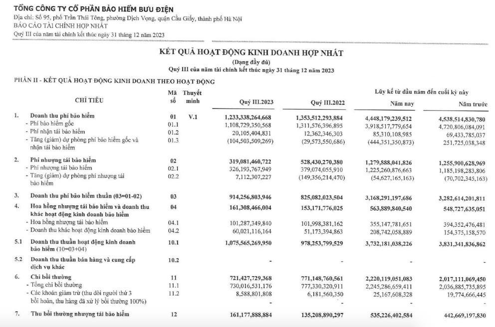 Về kết quả kinh doanh, trong quý III/2023, PTI ghi nhận doanh thu thuần hoạt động kinh doanh bảo hiểm đạt 1.075 tỷ đồng, tăng 10% so với cùng kỳ năm trước, chủ yếu do chi phí nhượng tái bảo hiểm (giảm 40%) giảm mạnh hơn doanh thu phí bảo hiểm gốc (giảm 15%).