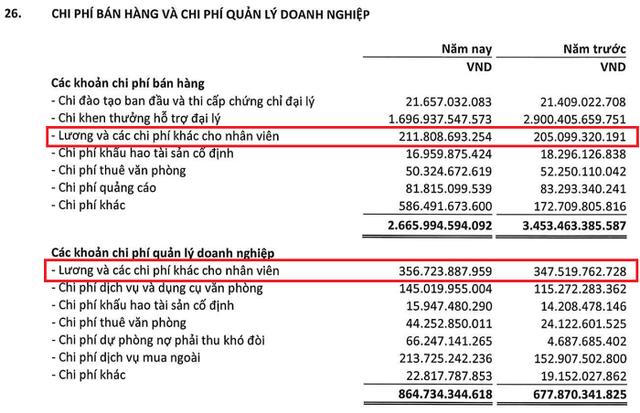 Cụ thể, trong chi phí bán hàng thì lương và các chi phí khác chi cho nhân viên là gần 212 tỷ đồng. Trong chi phí quản lý doanh nghiệp, lương và các chi phí khác cho nhân viên là gần 357 tỷ đồng. Tổng cộng gần 570 tỷ đồng là lương và chi phí khác được chi cho nhân viên của Sun Life Việt Nam.