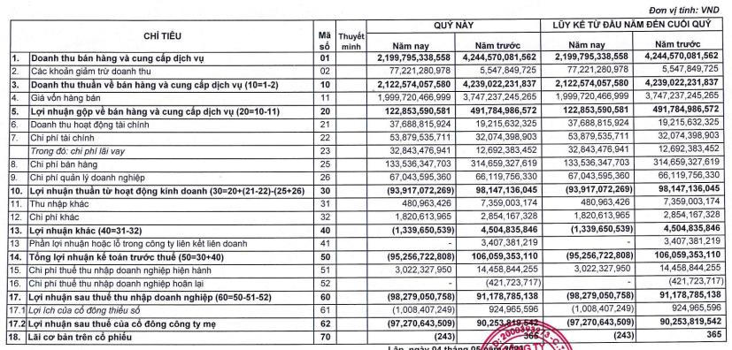Nợ phải trả của đến cuối quý 1 giảm 21% về mức 3.830 tỷ đồng trong đó 2.876 tỷ là vay nợ tài chính ngắn hạn. Việc vay nợ tài chính cao khiến chi phí lãi vay quý 1 của công ty tăng gấp 2,6 lần cùng kỳ lên mức 32,8 tỷ đồng.