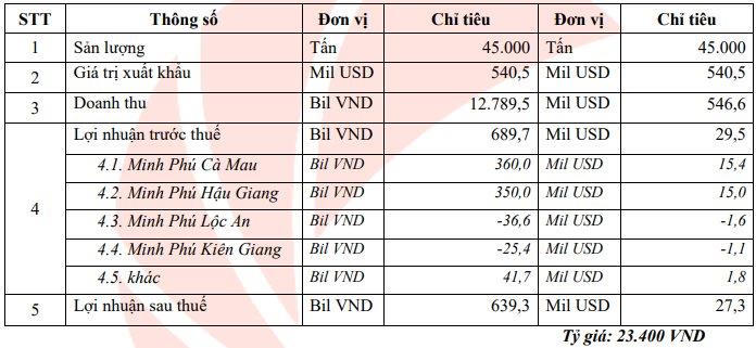 Kế hoạch lợi nhuận sau thuế giảm 23% xuống còn 639 tỷ đồng. Trong đó, Minh Phú Cà Mau dự kiến đóng góp 360 tỷ đồng vào LNST, trong khi Minh Phú Hậu Giang lãi 350 tỷ đồng. Ngược lại, Minh Phú Kiên Giang và Minh Phú Lộc An dự kiến lỗ trước thuế lần lượt 25 tỷ đồng và gần 37 tỷ đồng.