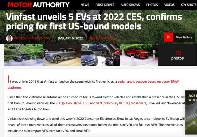 Chuyên trang nổi tiếng về ô tô Autoevolution giật tiêu đề lớn: “VinFast - hãng ô tô thuần điện của Việt Nam, có thể là Tesla tiếp theo” khi viết về những những hãng ô tô xuất hiện tại CES 2022. “Không nhiều người biết đến VinFast nhưng tất cả sẽ sớm biết”, Autoevolution nói về VinFast.