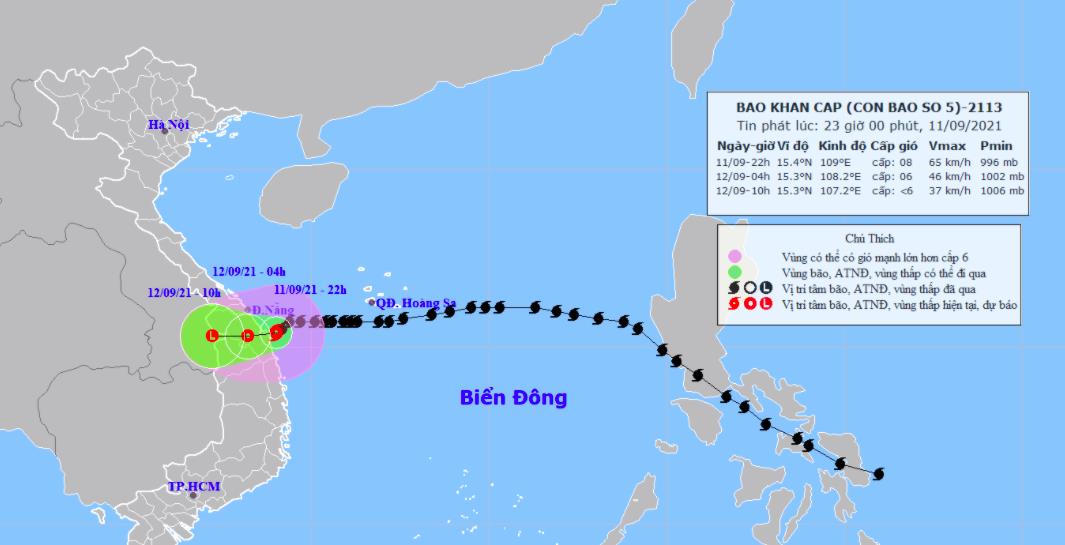 Vào lúc 22 giờ ngày 11/9, vị trí tâm bão ngay trên vùng biển từ Đà Nẵng đến Bình Định. Sức gió mạnh nhất vùng gần tâm bão mạnh cấp 8 (60-75km/giờ), giật cấp 10. Bán kính gió mạnh từ cấp 6, giật từ cấp 8 trở lên khoảng 100km tính từ tâm bão.