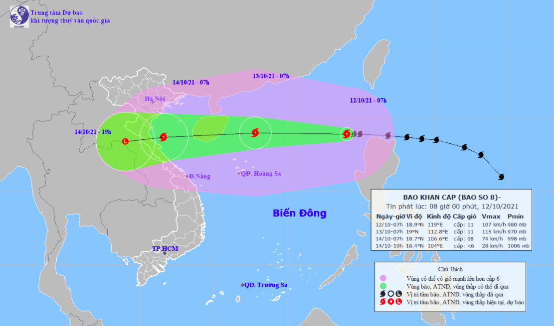 Từ ngày 12/10, thời tiết trên biển diễn biến xấu. Khu vực bắc Biển Đông có gió mạnh cấp 8-9, sau tăng lên cấp 10. Vùng gần tâm bão đi qua mạnh cấp 11, giật cấp 13, sóng cao 5-7 m.