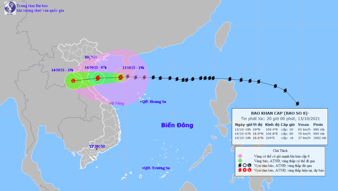 Lúc 19h, tâm bão nằm ở phía đông đảo Hải Nam (Trung Quốc), cách Thanh Hóa khoảng 420 km, Nghệ An 430 km, Hà Tĩnh khoảng 360 km. Sức gió mạnh nhất cấp 10, giật cấp 12.