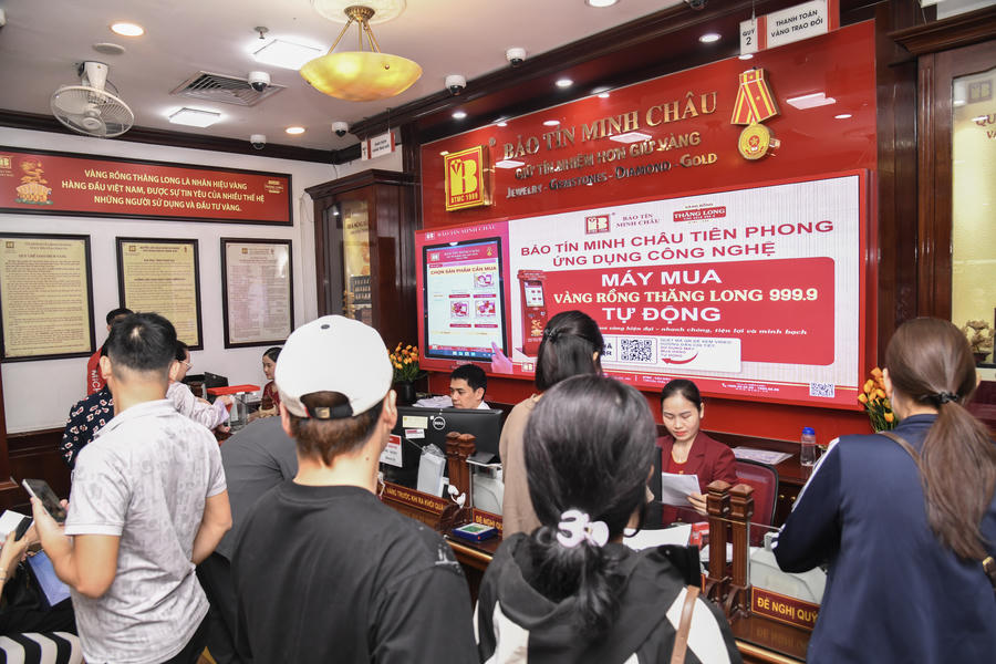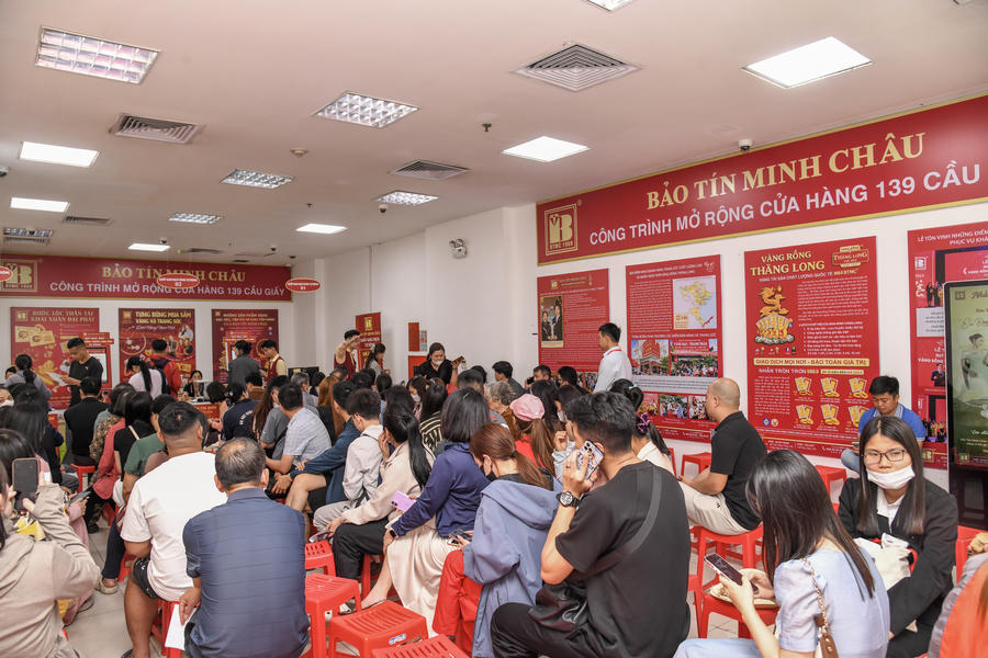 Ghi nhận tại cửa hàng Bảo Tín Minh Châu trên phố Trần Nhân Tông có khá nhiều người dân đến xếp hàng để chờ mua vàng, giao dịch diễn ra ổn định và khá sôi động. Phần lớn trong số những người chờ giao dịch là người dân đã đặt mua vàng trước đó và đến nhận theo lịch hẹn. Một số khách khác thì đến giao dịch mới.