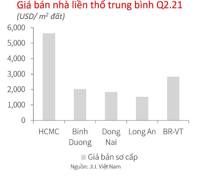 Hiện giá bán sơ cấp trung bình của nhà liền thổ thị trường TP HCM và các tỉnh lân cận đạt 2.849 USD/m2 (tương đương 65,5 triệu đồng). Nếu chỉ xét riêng tại TP HCM, mức giá nhà liền thổ lên tới hơn 5.600 USD/m2, tương đương 128 triệu đồng, cao gấp gần 3 lần giá tại Bình Dương.