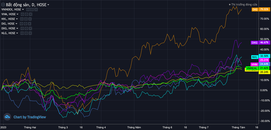 Trước đó, trong năm 2022, nhóm cổ phiếu bất động sản đã rơi rất mạnh trong bối cảnh siết chặt tín dụng và hoạt động phát hành trái phiếu. Không ít cổ phiếu đã “bốc hơi” trên 70% thị giá so với đỉnh, nhiều cái tên đã rơi xuống mức thấp nhất kể từ khi niêm yết. Mặc dù tăng mạnh từ đầu năm nhưng đa phần các cổ phiếu bất động sản vẫn còn thấp hơn rất nhiều so với đỉnh đạt được trong giai đoạn từ cuối 2021 đến đầu 2022.