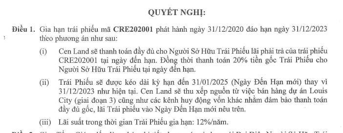 Cenland cho biết, công ty sẽ thanh toán đầy đủ cho trái chủ lãi phải trả và thanh toán 20% tiền gốc trái phiếu của lô trái phiếu trên tại ngày đáo hạn cũ là 31/12/2023. Trong thời gian trái phiếu được gia hạn, lãi suất trái phiếu là 12%/năm.