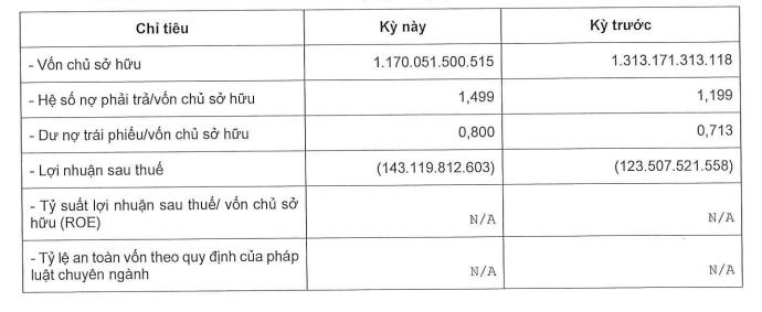 Hệ số nợ phải trả/vốn chủ sở hữu tăng từ 1,199 lần (tương ứng 1.574 tỷ đồng) hồi đầu năm, lên 1,499 lần (tương ứng 1.753 tỷ đồng). Trong đó, dư nợ trái phiếu là 936 tỷ đồng, chiếm 53,4% dư nợ phải trả của doanh nghiệp.