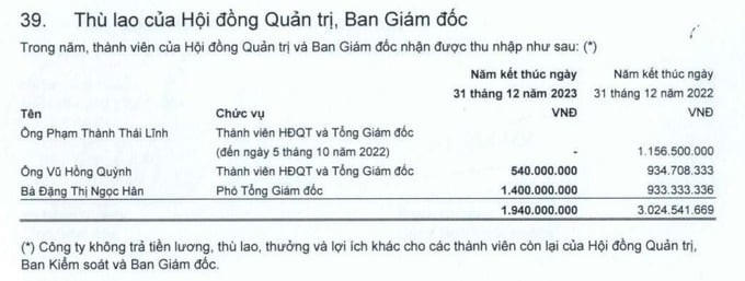 Trong đó, Thành viên Hội đồng quản trị kiêm Tổng Giám đốc Vũ Hồng Quỳnh nhận thu nhập 540 triệu đồng, giảm 42% so với mức nhận được năm 2022. Phó Tổng giám đốc Đặng Thị Ngọc Hân nhận thu nhập 1,4 tỷ đồng, tăng 50% so với năm trước.