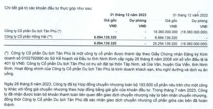 Theo thuyết minh, ngày 28/6/2023, NVT đã thoái toàn bộ sở hữu 4,58% vốn cổ phần tại Công ty cổ phần Du lịch Tân Phú với giá gốc 18,3 tỷ đồng. Đây cũng là khoản đầu tư mà Công ty đã trích lập dự phòng toàn bộ từ nhiều năm trước.