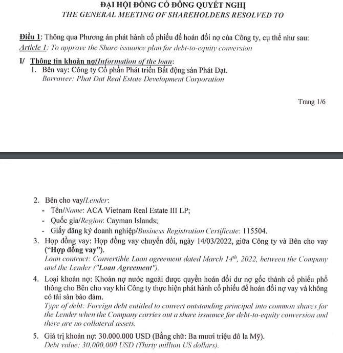 PDR trình để Đại hội thông qua phương án phát hành cổ phiếu để hoán đổi nợ cho chủ nợ ACA Vietnam Real Estate III LP (ACA Vietnam). Giá trị khoản nợ là 30 triệu USD.