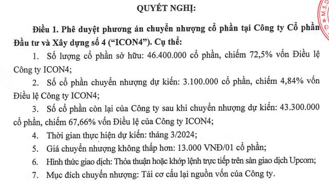 Theo đó, Bất động sản Taseco sẽ chuyển nhượng 3,1 triệu cổ phần, tương đương 4,84% vốn điều lệ công ty ICON4.