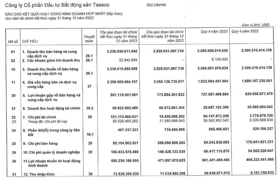 Lũy kế cả năm 2023, doanh thu thuần của TAL ghi nhận mức 3.238 tỷ đồng, tăng 14% so với năm trước. Trong cơ cấu doanh thu, mảng bất động sản tăng 10% ghi nhận tại 2.699 tỷ đồng; mảng xây lắp tăng 19% đạt 309 tỷ đồng; mảng cho thuê tăng 3,5 lần, đạt 116 tỷ đồng; mảng cung cấp dịch vụ 113 tỷ đồng, tăng 36%.