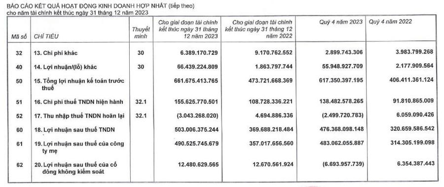 Về nguồn vốn, tổng nợ phải trả tại ngày 31/12/2023 đạt 6.038,9 tỷ đồng, tăng 49% so với đầu năm.