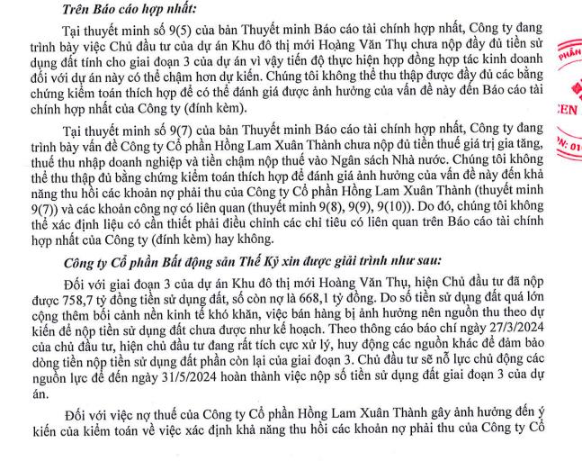 Theo đó, AASC không thể thu thập đủ bằng chứng kiểm toán thích hợp để đánh giá ảnh hưởng của vấn đề này đến khả năng thu hồi các khoản nợ phải thu của Hồng Lam Xuân Thành và các khoản công nợ có liên quan. Do đó, AASC không thể xác định liệu có cần thiết phải điều chỉnh các chỉ tiêu có liên quan trên báo cáo tài chính hợp nhất của Cenland hay không.
