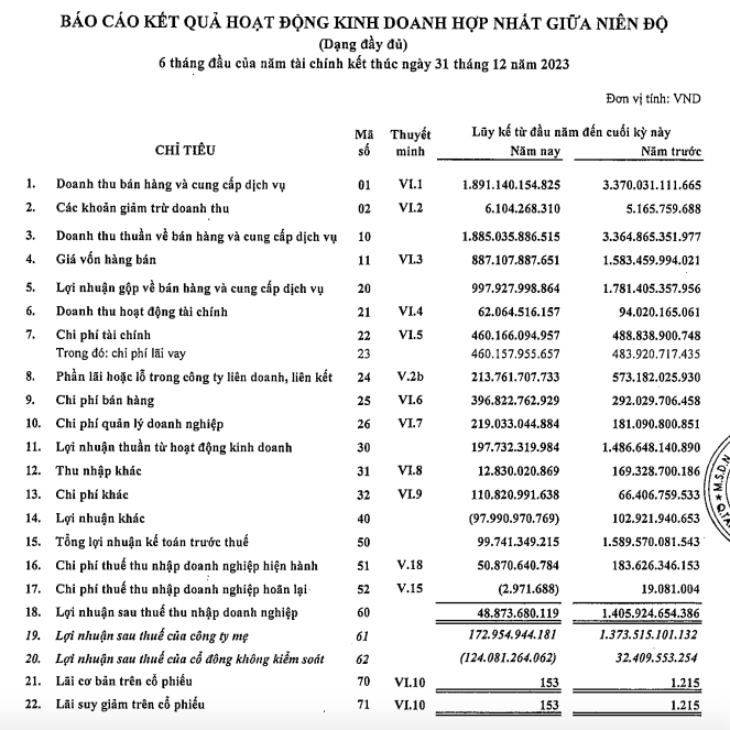 Tổng Công ty Đầu tư và Phát triển Công nghiệp - Công ty cổ phần (Becamex, mã ck: BCM) vừa công bố báo cáo tài chính hợp nhất soát xét bán niên 2023.