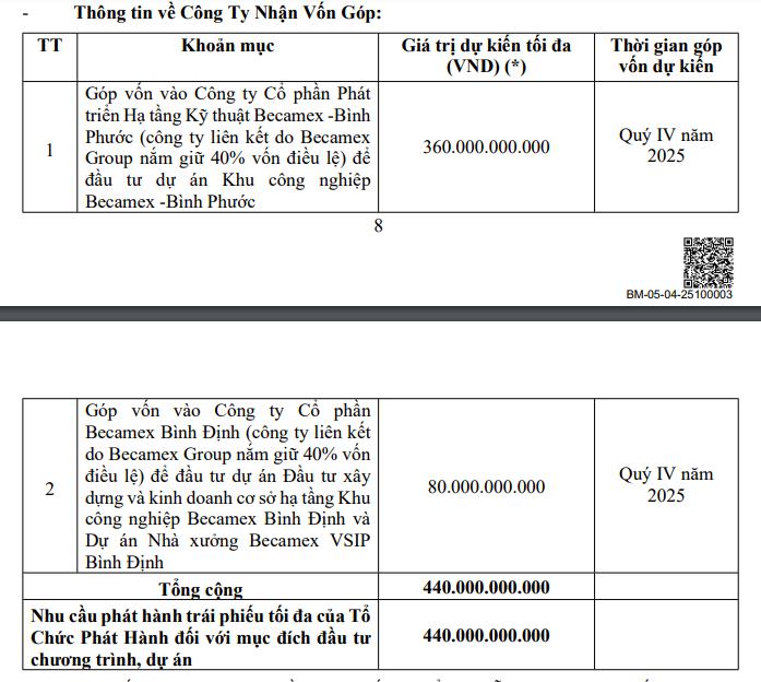 Theo đó, Becamex Group lên kế hoạch phát hành tối đa 20.000 trái phiếu, mệnh giá 100 triệu đồng/trái phiếu, qua đó huy động số tiền 2.000 tỷ đồng. Đây là loại trái phiếu không chuyển đổi, không kèm chứng quyền và được bảo đảm bằng tài sản, phát hành tại thị trường trong nước. Trái phiếu được phát hành dưới hình thức bút toán ghi sổ, tối đa 5 đợt. Kỳ hạn mỗi đợt từ 3 - 5 năm. Thời gian dự kiến phát hành từ tháng tháng 10/2025 đến tháng 12/2025.