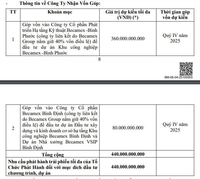 Becamex Group lên kế hoạch phát hành tối đa 20.000 trái phiếu, mệnh giá 100 triệu đồng/trái phiếu, qua đó huy động số tiền 2.000 tỷ đồng. Thời gian dự kiến phát hành từ tháng tháng 10/2025 đến tháng 12/2025.