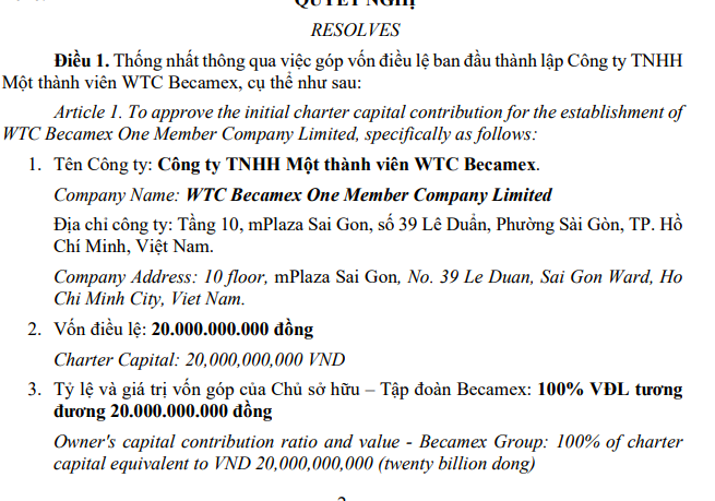 Cụ thể, WTC Becamex có vốn điều lệ dự kiến 20 tỷ đồng, trong đó Becamex Group sẽ góp toàn bộ số vốn này, tương đương tỷ sở hữu 100% vốn điều lệ. Thời gian góp vốn chậm nhất ngày 5/4/2026.