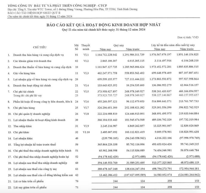 Theo báo cáo tài chính hợp nhất quý II/2024 của Tổng công ty Đầu tư và Phát triển Công nghiệp - Công ty cổ phần (Becamex IDC, mã ck: BCM), công ty ghi nhận doanh thu thuần quý II giảm 10% so với cùng kỳ, ghi nhận tại 1.161,8 tỷ đồng.