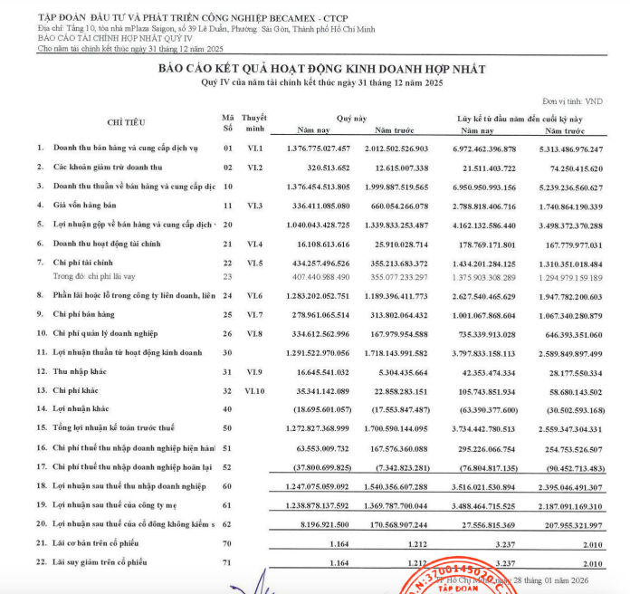 Về bức tranh tài chính, theo báo cáo kinh doanh hợp nhất quý IV/2025, Becamex IDC ghi nhận doanh thu đạt hơn 1.376 tỷ đồng, giảm 31,6% so với cùng kỳ năm trước. Lợi nhuận sau thuế đạt hơn 1.247 tỷ đồng, giảm 19% so với cùng kỳ.