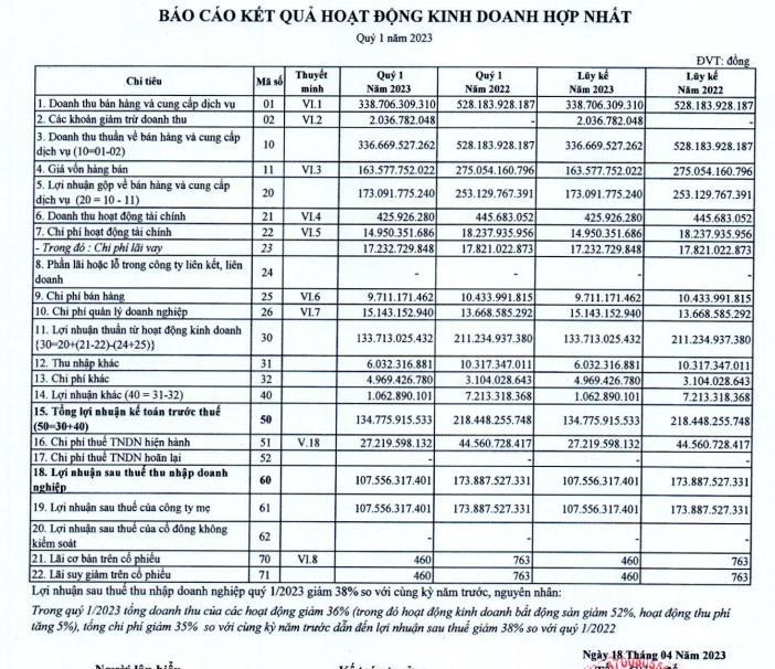 Về kết quả kinh doanh, trong 3 tháng đầu năm, Becamex IJC ghi nhận 336,6 tỷ đồng doanh thu thuần, giảm 36% so với cùng kỳ. Lợi nhuận sau thuế giảm 37%, về mốc 107,5 tỷ đồng.