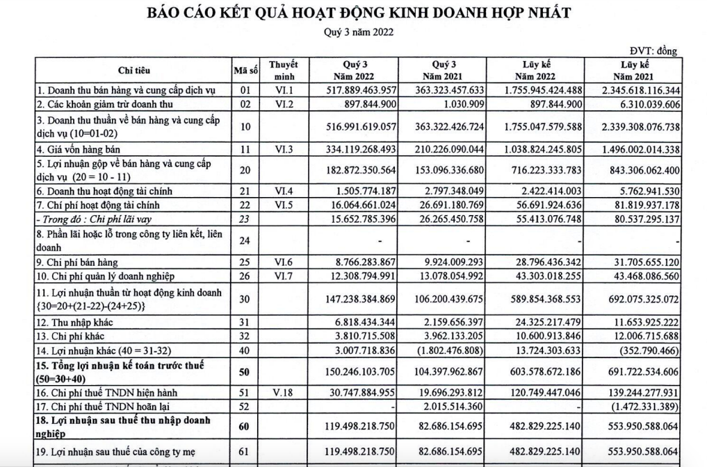 Trong kỳ, doanh thu hoạt động kinh doanh bất động sản tăng 11%, hoạt động thu phí tăng 1.023% do quý III/2021 bị ảnh hưởng của dịch Covid-19. Các khoản chi phí tài chính, bán hàng, quản lý doanh nghiệp giảm so với cùng kỳ. Kết quả, lợi nhuận sau thuế đạt 119,5 tỷ đồng, tăng 44,53% so với cùng kỳ năm trước.