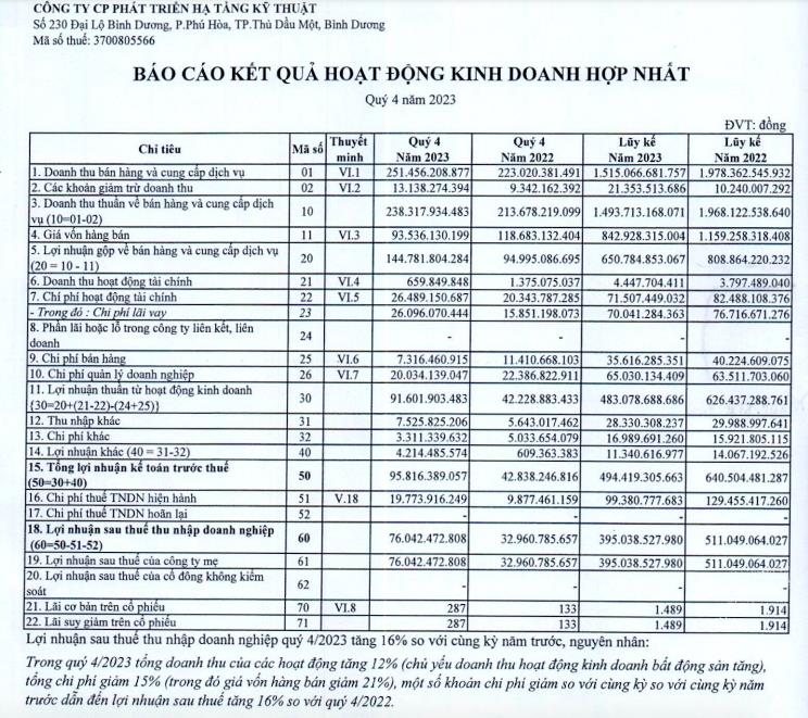 Về kết quả kinh doanh, quý IV/2023, IJC ghi nhận doanh thu thuần đạt 238,3 tỷ đồng, tăng 12% so với cùng kỳ.