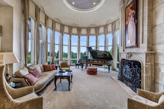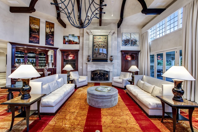 Phòng khách rộng lớn, sang trọng, được trang hoàng với những nội thất cao cấp, thanh lịch. Ngôi nhà này có diện tích gần 4.200 m2 với 11 phòng ngủ và 24 phòng tắm.