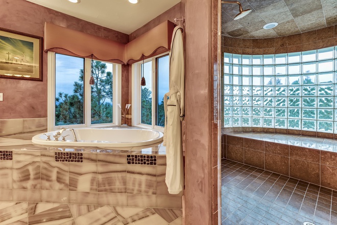 Phòng tắm chính rực rỡ, mang tông màu hồng chủ đạo và được lát đá mã não sang trọng.