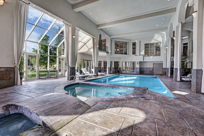 Hồ bơi và bồn ngâm nước nóng trong nhà được tích hợp ở một không gian rộng lớn, tràn ngập ánh sáng tự nhiên.
