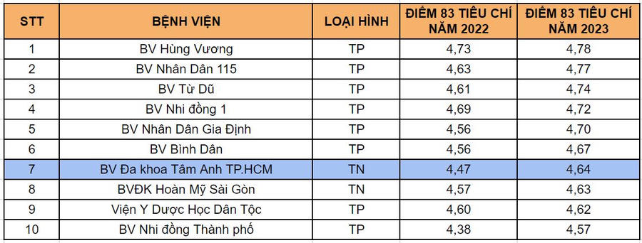 Sở Y tế TP.HCM vừa công bố điểm chất lượng của 120 bệnh viện, trong đó Bệnh viện Đa khoa Tâm Anh đứng top 7, dẫn đầu nhóm bệnh viện tư nhân.