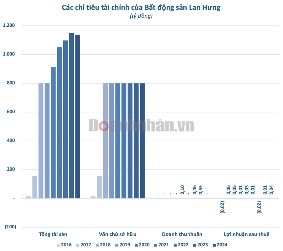 Tập đoàn Bất động sản Lan Hưng (BĐS Lan Hưng), dù tăng vốn lên 800 tỷ đồng và liên tục đề xuất hàng loạt dự án quy mô lớn tại nhiều tỉnh thành, lại phơi bày một bức tranh tài chính chưa tương xứng. Kết quả kinh doanh cho thấy doanh nghiệp này trải qua nhiều năm không ghi nhận doanh thu, lợi nhuận mỏng và hoạt động chủ yếu dựa vào doanh thu tài chính từ tiền gửi.