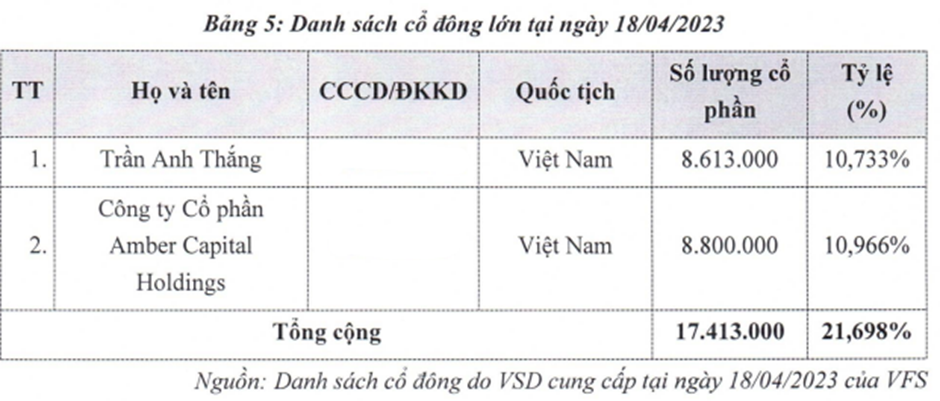 Trong cơ cấu cổ đông lớn của VFS tại ngày 18/04, ông Trần Anh Thắng nắm giữ hơn 8.6 triệu cp (tỷ lệ 10,733%) và CTCP Amber Capital Holdings (sở hữu 10,966%).