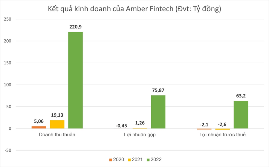 Theo số liệu chúng tôi có được, doanh thu thuần của Amber Fintech năm 2022 tăng hơn 10 lần so với năm 2021, ghi nhận hơn 220 tỷ đồng. Biên lãi gộp ở mức hơn 34%, ghi nhận hơn 75 tỷ đồng. Lợi nhuận sau thuế của doanh nghiệp này là hơn 50 tỷ đồng trong năm 2022, bằng 50% quy mô vốn chủ sở hữu. Kết quả này đưa Amber Fintech trở thành một trong những công ty có hiệu suất tốt nhất trong mảng kinh doanh này hiện nay.
