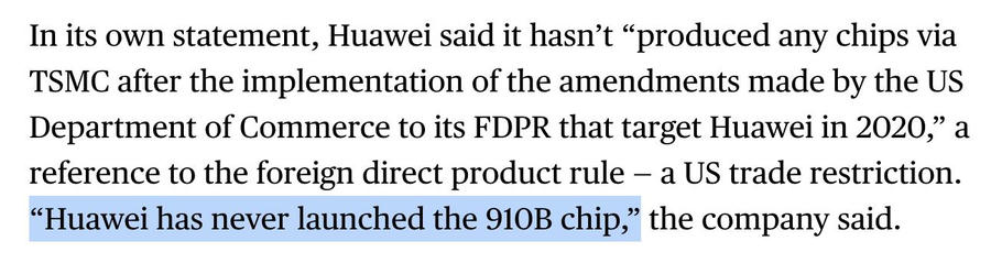 Đáng nói, khi được Bloomberg News hỏi về chip Ascend 910B, Huawei tiếp tục khẳng định: “Huawei chưa bao giờ ra mắt chip 910B.”
