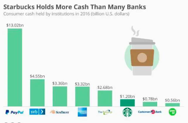 Giống như cách ngân hàng lưu trữ tiền từ khách hàng, Starbucks thu một lượng lớn tiền mặt thông qua Starbucks Rewards. Điều thú vị là số tiền này còn lớn hơn lượng tiền mặt mà nhiều ngân hàng đang nắm giữ.