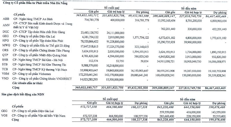 Tính đến 31/03/2023, tổng giá gốc của danh mục đầu tư Nhà Đà Nẵng vào mức 365 tỷ đồng, Công ty đang dự phòng đến 49 tỷ đồng. Các mã chiếm tỷ trọng lớn hiện tại có VHM (Vinhomes) với 172 tỷ, mã HPG (Hoà Phát) với hơn 75 tỷ đồng, mã TCB của Tecombank với gần 36 tỷ đồng…